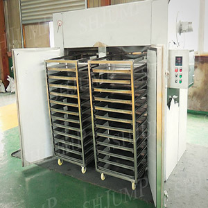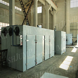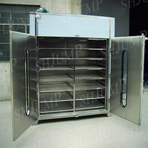 Hot air drying oven with air as the carrier, make heat with steam or electricity or hot blast stove, from outside the box into the air after switch heating temperature, the fan forced circulation layered advection material for heat exchange after baking tray and bake dish, and take away the material moisture (water), returned to the heat exchanger (steam heating, electric heating) heating heating up again. After so many times cycle, hot air moisture increasing, the ability to absorb material moisture content is reduced, the need to open the platoon is wet valve, excluding some high wet hot air, breathe in some low temperature cold wind, in order to achieve the purpose of continuous dry material.