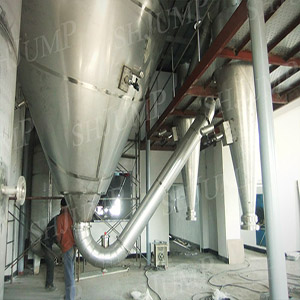The air is filtered and heated, entering the air distributor at the top of the dryer, and the hot air spirals into the drying chamber. The high - speed centrifugal atomizer at the top of the tower body is made of very fine mist droplets, which can be dried as finished products in very short periods of time with hot air and flow. The finished product is exported continuously from the drying tower bottom and the cyclone separator. The exhaust gas is emptied by the fan.