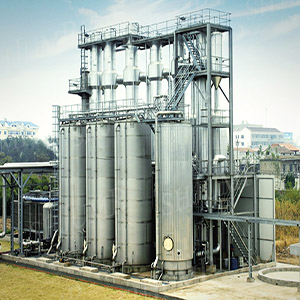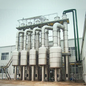 Falling film evaporation is the material liquid from falling film evaporator tube box on the heating chamber, the liquid distribution and film forming device, even within the assigned to each heat exchange tube, under the action of gravity and vacuum induction and airflow, into homogeneous membrane flow from top to bottom. The shell side of the flow in the process, by heating medium heating vaporization and separation of the steam produced from the liquid into the evaporator chamber, the vapour liquid after the separation, the steam entering the condenser condensate (single-effect operation) or into the next effect evaporator as a heating medium, so as to realize multiple effect, liquid discharge by the separation chamber.